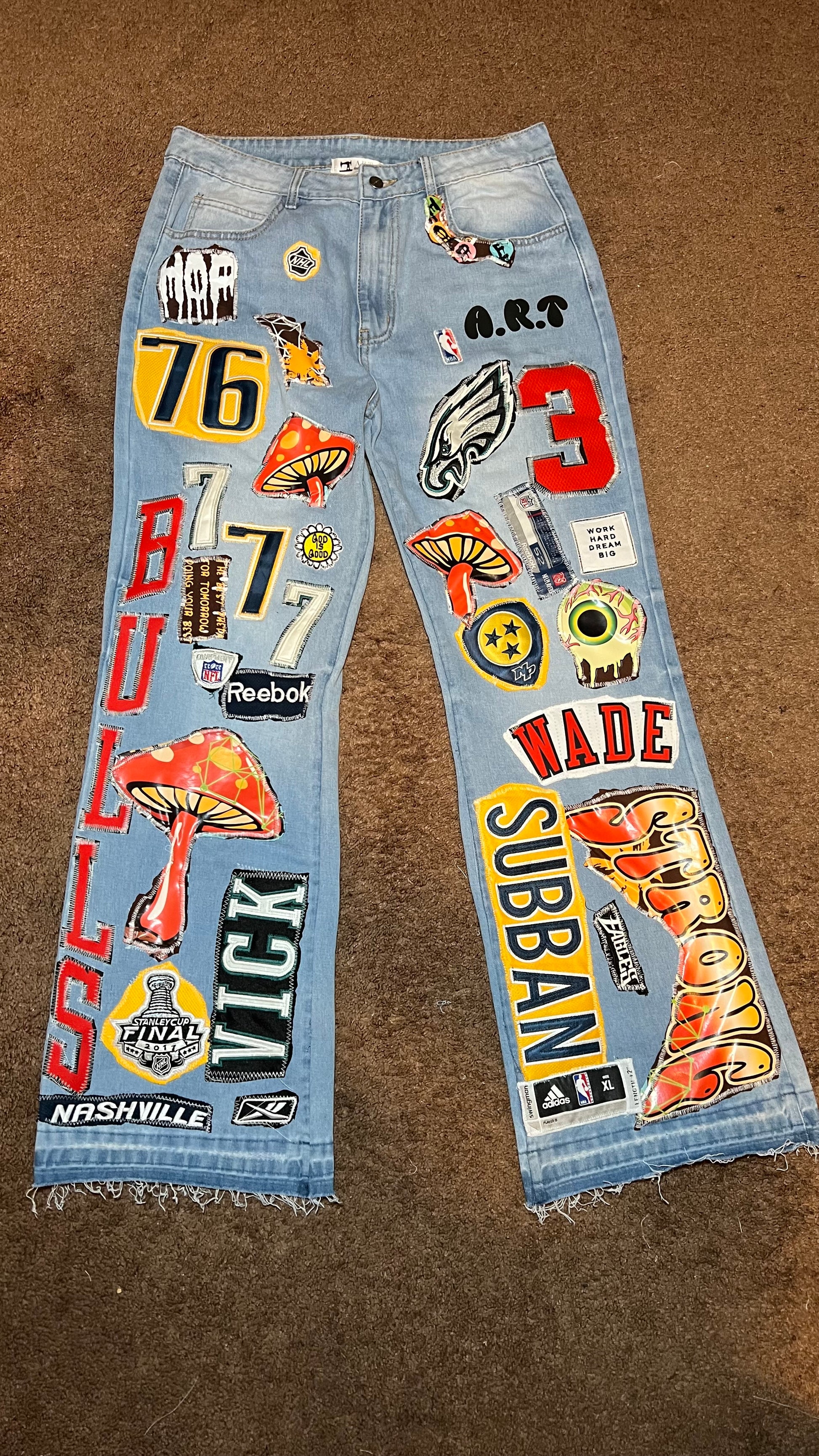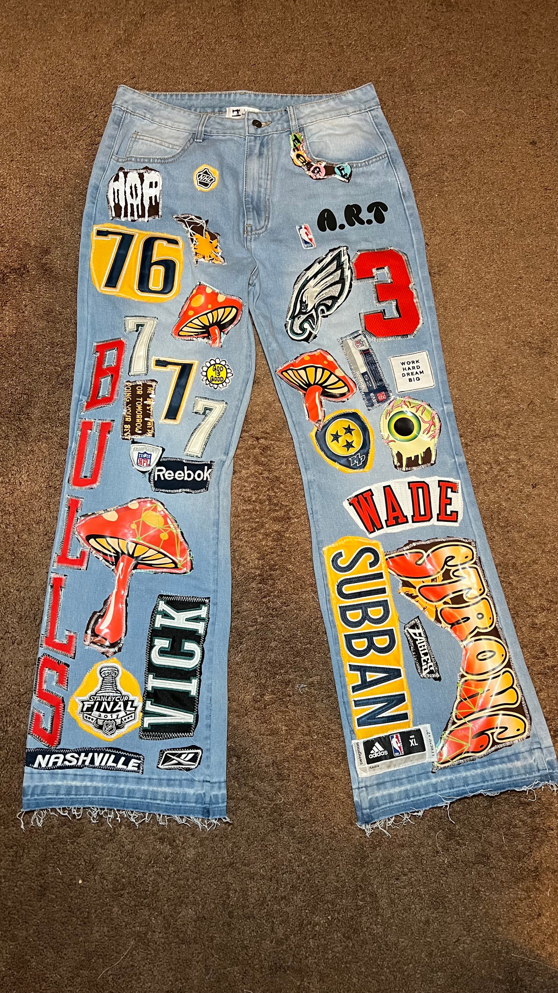 Handcrafted and covered in real stitched and appliqué patches from NBA, NFL, NHL, and MLB gear, these jeans are a true collector’s piece. From the Chicago Bulls to Subban, Vick, and Astros references, each patch is carefully selected and sewn to create a visually chaotic and unforgettable statement. Finished with hand-frayed hems and detailed mushroom graphics, these pants are art in motion.