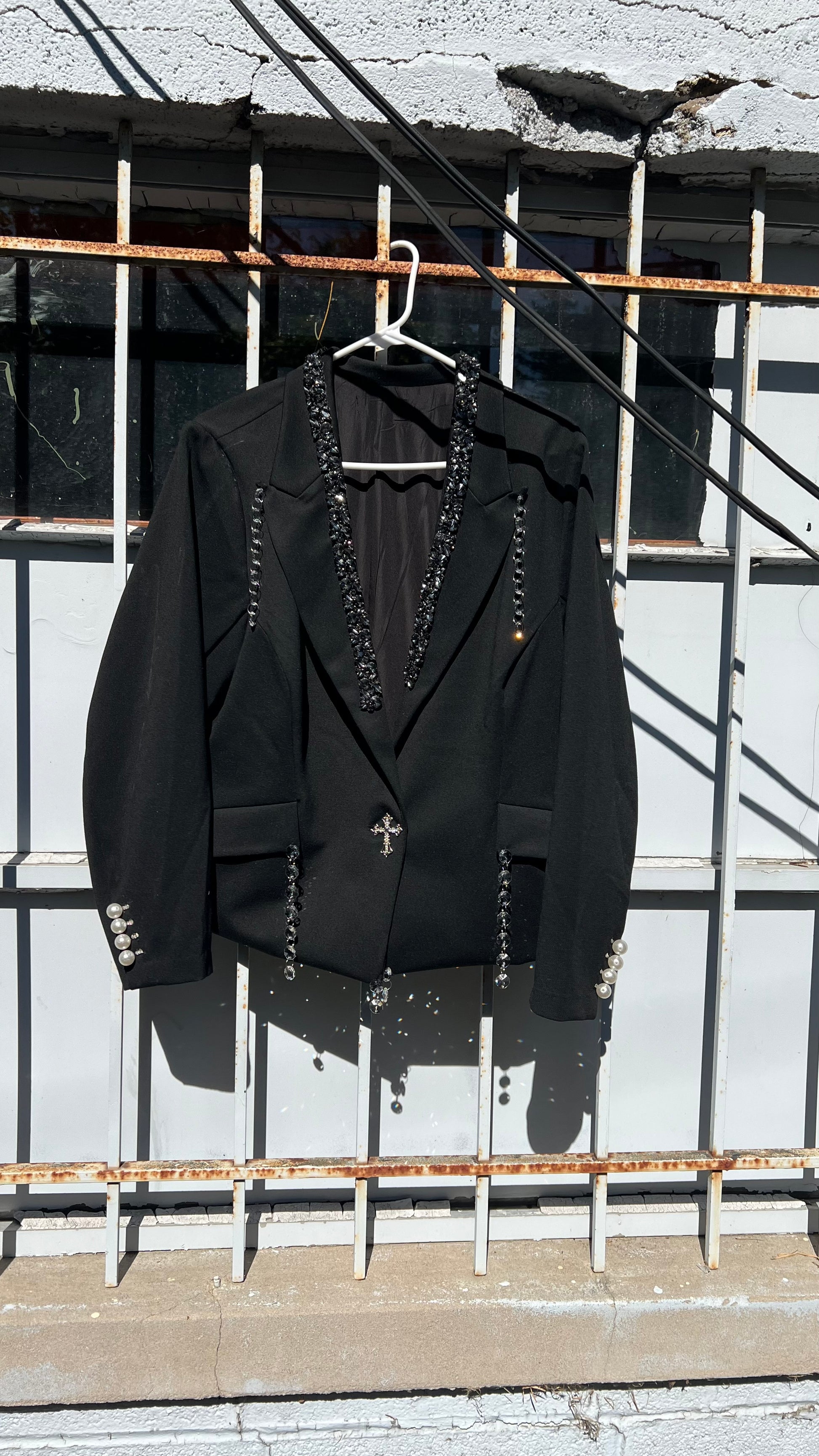 Command attention with the Saint Noir Blazer — a bold fusion of faith and fashion. Crafted in sleek black, this statement piece features hand-applied jeweled trims, pearl-detailed cuffs, and a signature cross accent symbolizing grace and strength. Designed for those who walk with purpose and stand out with presence, the Saint Noir embodies street luxury with divine energy.