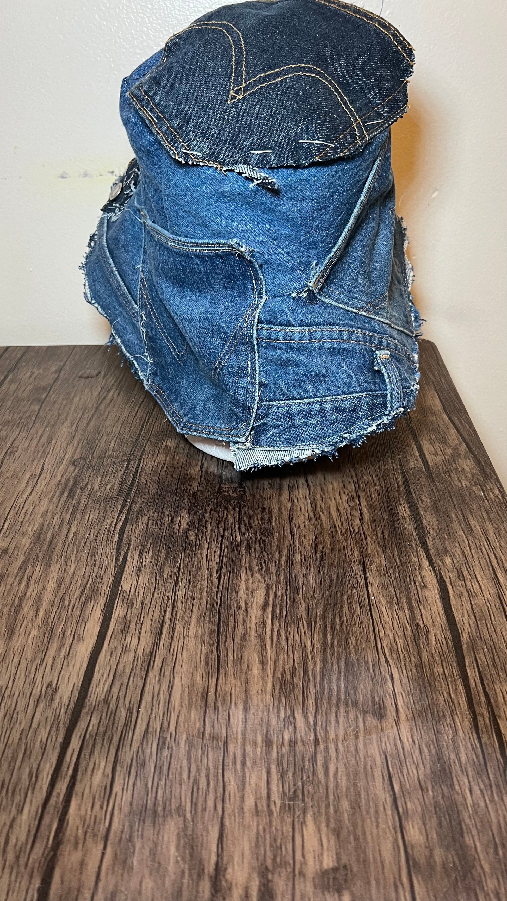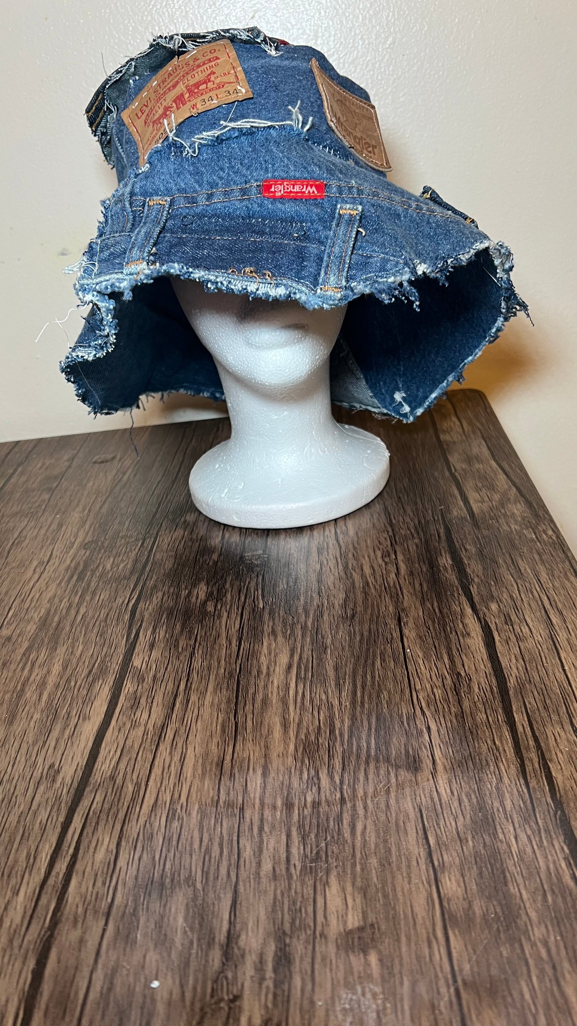 This bold bucket hat is a patchwork trophy made from real Levi’s, Wrangler, and other denim label tags—an upcycled celebration of classic American denim heritage. Frayed edges, visible seams, and layered textures give it a gritty, DIY punk energy, while the branded tags scream authenticity. It’s raw, rugged, and real. Perfect for someone who wants their hat to talk louder than words.